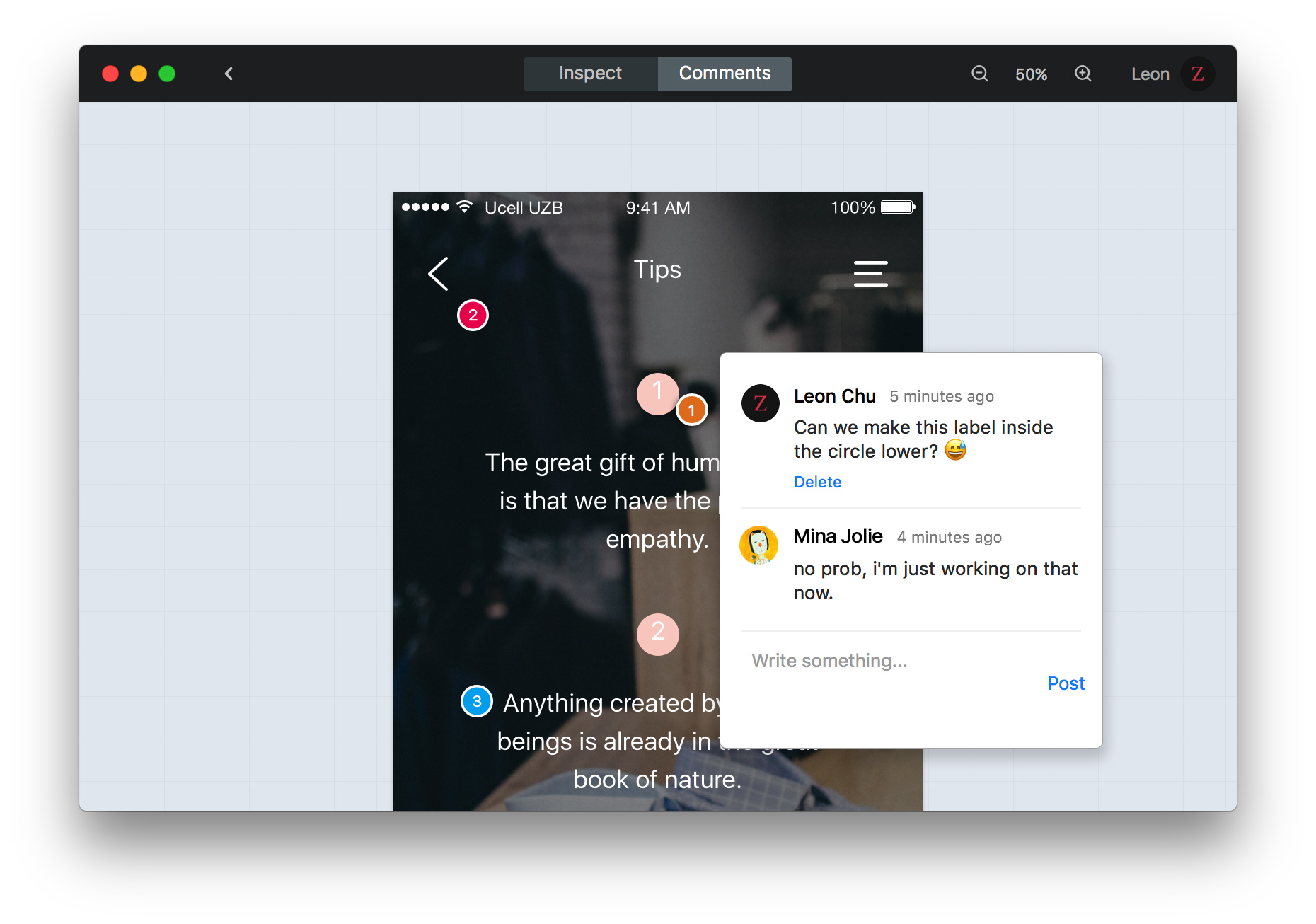 Developers can inspect design specs, copy layer info, export and save assets, generate CSS, JavaScript, Sass, Less, etc. code. The developer / design handoff workflow helps your team deliver product faster.